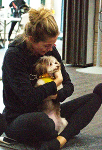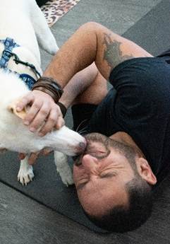 However, Tristan spent his time more wisely: he figured out that the yogis were delighted to give him unlimited belly rubs; all he had to do was show them his fabulous little belly. He hammed it up, from lying on their yoga mats to full-on kisses on the first date. Ginger, a tiny mutt of unknown origins, pranced around the bodies in motion without a care in the world because she was the boss, and everyone knew it too. Yogi, a shih tzu and unknown mix, selected a few lucky individuals to dote on him as he made his rounds. Dopey, a chihuahua (without a dress); Gracie, a chihuahua (with a dress); and Tootsie, a white and beige mixed breed, all courageously dove into the sea of practitioners to sop up all the love they could evoke and evoke they did.