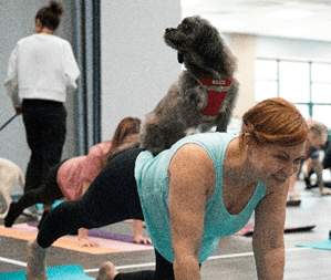 Most of the participants completed the entire class, a fact that lies somewhere between surprising and unbelievable. Typically, about two-thirds of the yogis can’t stand strong in the wake of the doggy maelstrom. The doggy yoga class opened with a gentle supta balasana, a pose where you lay on your back, draw your knees into your chest and wrap your arms around your knees. It was practically child’s play because the pups hadn’t warmed up to the idea quite yet. By the time the yogis were in table pose five minutes later, all bets were off.
